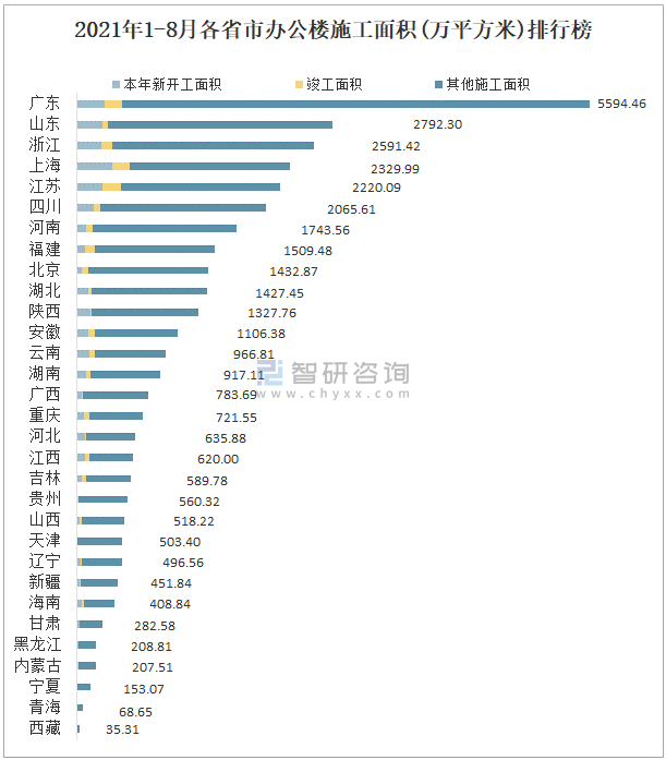2021年1-8月各省市辦公樓施工面積(萬平方米)排行榜