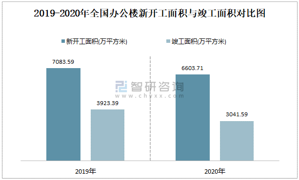 2019-2020年全國辦公樓新開工面積與竣工面積對比圖