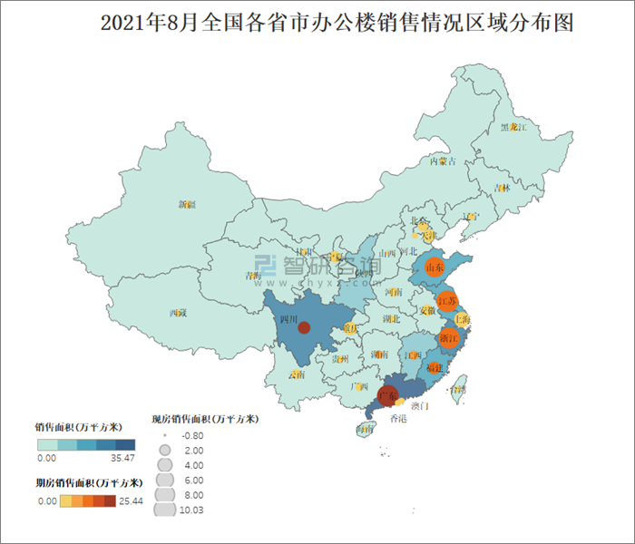 2021年8月全國各省市辦公樓銷售情況區域分布圖