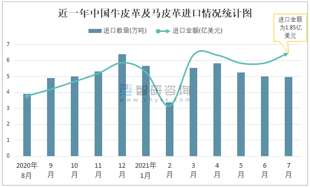 根據中國海關數據顯示:2021年7月中國牛皮革及馬皮革進口數量為4.97萬噸,同比增長45.2%,進口金額為1.85億美元,同比增長81.7%,2021年1-7月中國牛皮革及馬皮革進口數量為35.6萬噸,進口金額為11.22億美元。