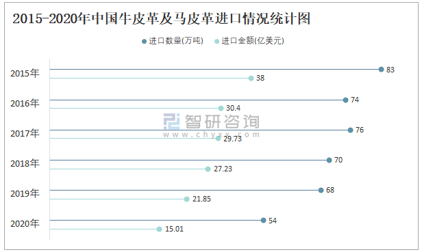 2015-2020年中國牛皮革及馬皮革進口情況統計圖