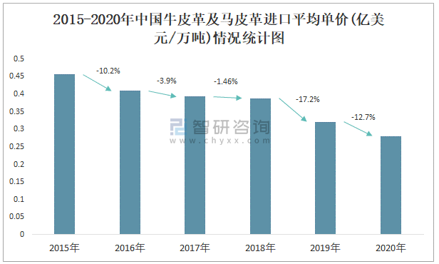 根據中國海關數據顯示:2015-2020年中國牛皮革及馬皮革進口數量總體呈下降趨勢,進口金額逐年遞減;2015-2020年中國牛皮革及馬皮革進口平均單價逐年遞減, 2019年中國牛皮革及馬皮革進口平均單價下降速度最快,下滑了17.2%。