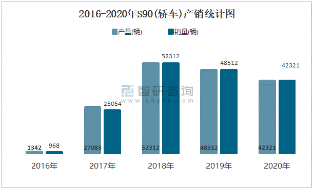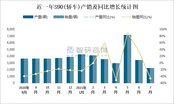 根據中國汽車工業協會數據可知:2021年7月S90(轎車)產量為2200輛,同比下降45.9%,銷量為2200輛,同比下降45.9%,當月產銷率為100%;2021年1-7月S90(轎車)累計產量為27502輛,同比增長14.7%,累計銷量為27502輛,同比增長14.7%,累計產銷率為100%;2016-2020年S90(轎車)產銷量均在2018年達到最高值,此后逐年遞減,且近5年總產量大于總銷量,積壓了庫存2403輛。