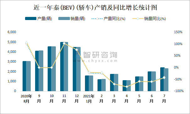 根據中國汽車工業協會數據可知:2021年7月秦(BEV)(轎車)產量為2393輛,同比下降40.3%,銷量為2279輛,同比下降42.9%,當月產銷率為95.24%;2021年1-7月秦(BEV)(轎車)累計產量為11061輛,同比下降59.3%,累計銷量為10970輛,同比下降59.6%,累計產銷率為99.18%;2016-2020年秦(BEV)(轎車)產銷量均在2017年跌至最低值,此后逐年遞增,且近5年總產量大于總銷量,積壓了庫存57輛。