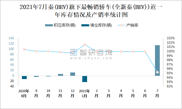 2021年7月秦(BEV)旗下最暢銷車(全新秦(BEV))近一年庫存情況及產銷率統計圖