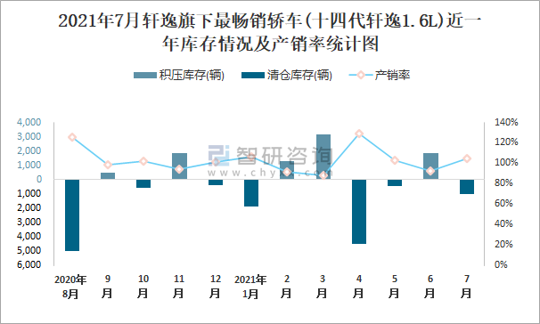 2021年7月軒逸旗下最暢銷車(十四代軒逸1.6L)近一年庫存情況及產(chǎn)銷率統(tǒng)計(jì)圖