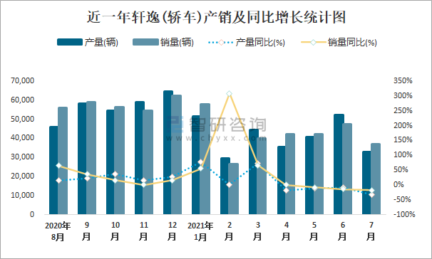 根據(jù)中國汽車工業(yè)協(xié)會(huì)數(shù)據(jù)可知:2021年7月軒逸(轎車)產(chǎn)量為32962輛,同比下降33%,銷量為37067輛,同比下降17.7%,當(dāng)月產(chǎn)銷率為112.45%;2021年1-7月軒逸(轎車)累計(jì)產(chǎn)量為286666輛,同比增長13.6%,累計(jì)銷量為293230輛,同比增長15.1%,累計(jì)產(chǎn)銷率為102.29%;2014-2020年軒逸(轎車)產(chǎn)銷量總體呈現(xiàn)上升趨勢(shì),2020年達(dá)到最大值,且近7年總產(chǎn)量大于總銷量,積壓了庫存5891輛。