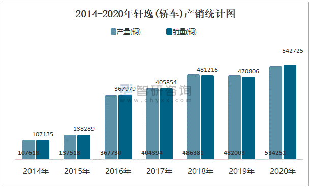 2014-2020年軒逸(轎車)產(chǎn)銷統(tǒng)計(jì)圖