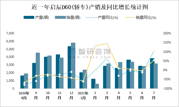根據中國汽車工業協會數據可知:2021年7月啟辰D60(轎車)產量為3808輛,同比增長104.8%,銷量為3132輛,同比增長55.2%,當月產銷率為82.25%;2021年1-7月啟辰D60(轎車)累計產量為18886輛,同比下降3%,累計銷量為18696輛,同比增長2.4%,累計產銷率為98.99%;2017-2020年啟辰D60(轎車)產銷量均在2019年達到最高值,此后大幅度下滑,且近4年總產量大于總銷量,積壓了庫存1633輛。
