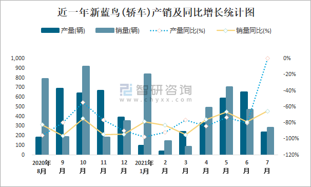 近一年新藍(lán)鳥(niǎo)(轎車(chē))產(chǎn)銷(xiāo)及同比增長(zhǎng)統(tǒng)計(jì)圖