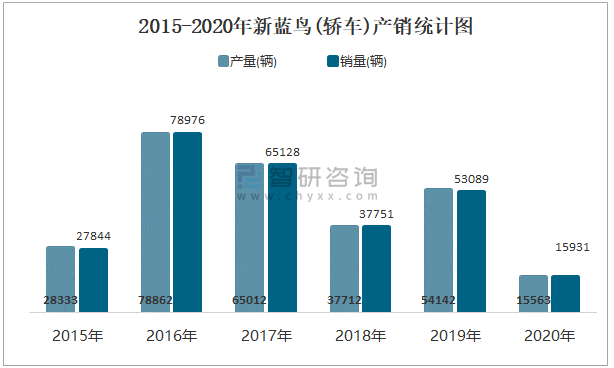 2015-2020年新藍(lán)鳥(niǎo)(轎車(chē))產(chǎn)銷(xiāo)統(tǒng)計(jì)圖