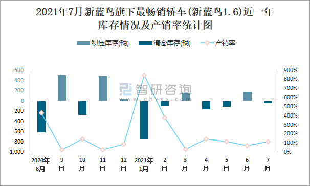 2021年7月新藍(lán)鳥(niǎo)旗下最暢銷(xiāo)車(chē)(新藍(lán)鳥(niǎo)1.6)近一年庫(kù)存情況及產(chǎn)銷(xiāo)率統(tǒng)計(jì)圖