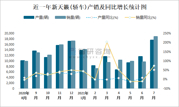 根據(jù)中國(guó)汽車工業(yè)協(xié)會(huì)數(shù)據(jù)可知:2021年7月新天籟(轎車)產(chǎn)量為17589輛,同比增長(zhǎng)53%,銷量為18858輛,同比增長(zhǎng)74.5%,當(dāng)月產(chǎn)銷率為107.21%;2021年1-7月新天籟(轎車)累計(jì)產(chǎn)量為79189輛,同比增長(zhǎng)58.3%,累計(jì)銷量為79723輛,同比增長(zhǎng)49.5%,累計(jì)產(chǎn)銷率為100.67%;2016-2020年新天籟(轎車)產(chǎn)銷量總體呈現(xiàn)上升趨勢(shì),且近5年總銷量大于總產(chǎn)量,清倉(cāng)庫(kù)存5509輛。