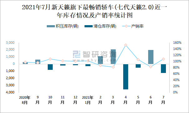 2021年7月新天籟旗下最暢銷車(七代天籟2.0)近一年庫(kù)存情況及產(chǎn)銷率統(tǒng)計(jì)圖