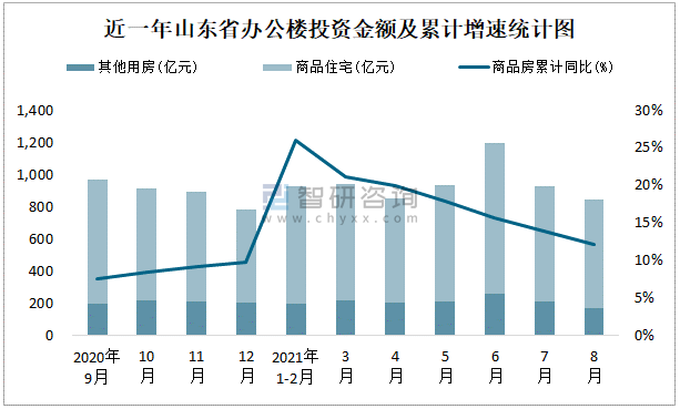 根據國家統計局數據統計可知:2021年8月山東省房地產開發投資商品房投資金額為844.68億元,其中包括辦公樓、商業營業用房等其他用房169.28億元(注:辦公樓、商業營業用房未分開統計);2021年1-8月山東省房地產開發投資包括辦公樓在內的其他用房累計金額為1452.97億元。