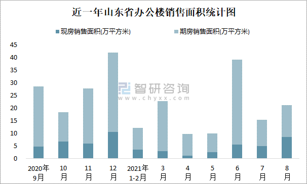 根據國家統計局數據可知:2021年8月山東省辦公樓銷售面積為21.03萬平方米(其中銷售現房8.52萬平方米,期房12.51萬平方米);2021年1-8月山東省辦公樓累計銷售面積為130.53萬平方米;近一年山東省辦公樓期房銷售面積遠高于現房銷售面積。