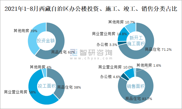 根據國家統計局數據統計可知:2021年1-8月西藏自治區房地產開發企業在包括辦公樓在內的其他用房投資金額占比為39.3%(注:只有投資金額中其他用房包含辦公樓、商業營業用房),辦公樓的新開工面積與竣工面積所占比重差異不大,從銷售面積來看,辦公樓銷售面積占比少于商業營業用房銷售面積占比。