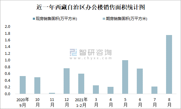根據國家統計局數據可知:2021年8月西藏自治區辦公樓銷售面積為1.75萬平方米(均為期房);2021年1-8月西藏自治區辦公樓累計銷售面積為4.78萬平方米。