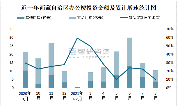 根據國家統計局數據統計可知:2021年8月西藏自治區房地產開發投資商品房投資金額為10.43億元,其中包括辦公樓、商業營業用房等其他用房3.7億元(注:辦公樓、商業營業用房未分開統計);2021年1-8月西藏自治區房地產開發投資包括辦公樓在內的其他用房累計金額為38.75億元。