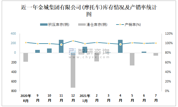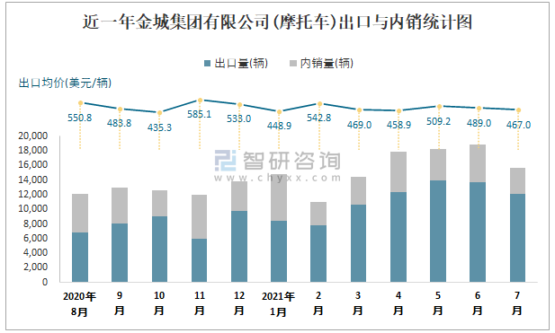 根據中國汽車工業(摩托車)產銷快訊數據統計可知:2021年7月中國摩托車產量總計為1721567輛,同比增長5.6%,銷量總計為1721887輛,同比增長4.26%,產銷率約為100.02%,清倉庫存-320輛,其中總計出口量為723084輛,內銷998803輛,出口均價約為633.62美元/輛。金城集團有限公司作為江蘇本土車企的摩托車企業之一,7月銷量相較于同類型車企,排名第4,且以出口為主。