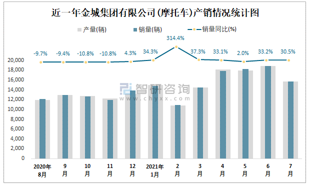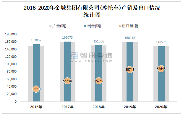 根據中國汽車工業(摩托車)產銷快訊數據顯示:2021年7月金城集團有限公司(摩托車)產量為15661輛,同比增長29.45%,銷量為15720輛,同比增長30.5%;2021年1-7月金城集團有限公司(摩托車)累計產量為110756輛,同比增長28.83%,累計銷量為110833輛,同比增長30.16%;2016-2020年金城集團有限公司(摩托車)產銷量2017年達到最高值,此后總體呈現下降趨勢,且近5年總銷量大于總產量,清倉庫存7130輛,出口量逐年遞增。