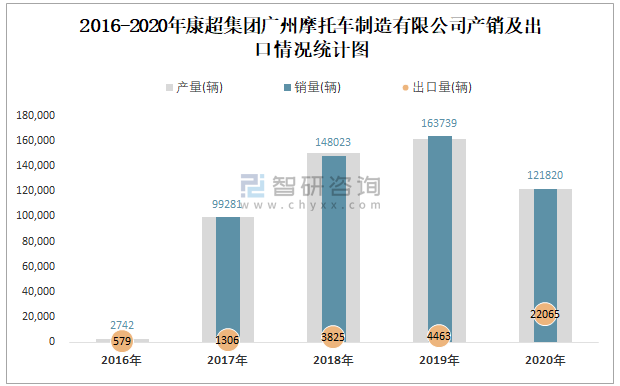 2016-2020年康超集團廣州摩托車制造有限公司產銷及出口情況統計圖
