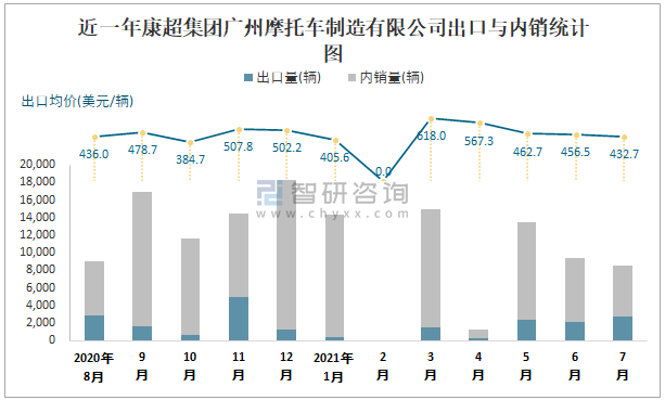 根據中國汽車工業(摩托車)產銷快訊數據統計可知:近一年康超集團廣州摩托車制造有限公司(摩托車)出口量偏少,銷量以內銷為主,總出口量占比總銷量的15.7%,出口均價3月達到最高值,此后有所下滑,其中7月出口量為2699輛,出口均價約為432.68美元/輛;2021年1-7月康超集團廣州摩托車制造有限公司(摩托車)累計出口量為9386輛,同比下降12.66%,累計出口金額約為449.06萬美元,同比下降8.62%。