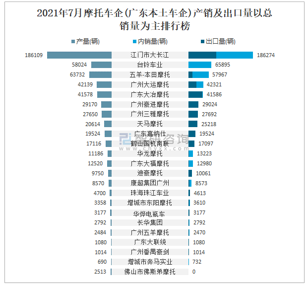 2021年7月摩托車企(廣東本土車企)產銷及出口量(以總銷量為主)排行榜