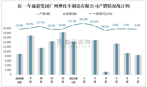 近一年康超集團廣州摩托車制造有限公司產銷情況統計圖