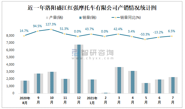 根據中國汽車工業(摩托車)產銷快訊數據顯示:2021年7月洛陽盛江紅強摩托車有限公司(摩托車)產量為2275輛,同比增長6.46%,銷量為2275輛,同比增長6.46%;2021年1-7月洛陽盛江紅強摩托車有限公司(摩托車)累計產量為14388輛,同比增長7.14%,累計銷量為14388輛,同比增長7.14%;2018-2020年洛陽盛江紅強摩托車有限公司(摩托車)產銷量2019年跌至最低值,此后有所回升,且近3年總銷量等于總產量,無積壓庫存,庫存管理良好,暫未出口,全部依靠內銷。