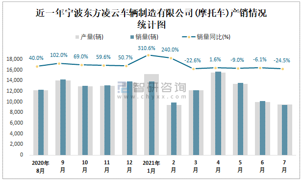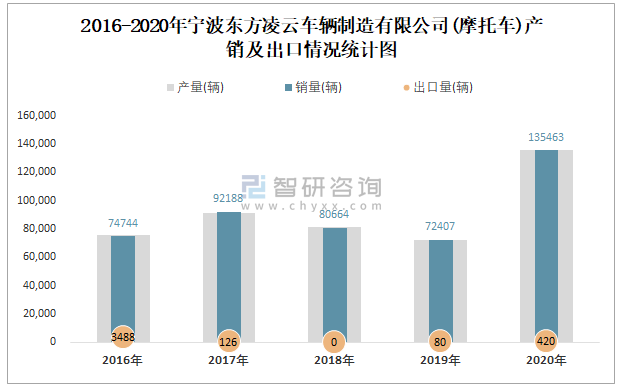 根據(jù)中國汽車工業(yè)(摩托車)產(chǎn)銷快訊數(shù)據(jù)顯示:2021年7月寧波東方凌云車輛制造有限公司(摩托車)產(chǎn)量為9484輛,同比下降23.69%,銷量為9406輛,同比下降24.45%;2021年1-7月寧波東方凌云車輛制造有限公司(摩托車)累計產(chǎn)量為85016輛,同比增長21.97%,累計銷量為84705輛,同比增長22.5%;2016-2020年寧波東方凌云車輛制造有限公司(摩托車)產(chǎn)銷量2019年跌至最低值,此后有所回升,且近5年總產(chǎn)量大于總銷量,積壓了庫存745輛,出口量偏少,銷量以內(nèi)銷為主。