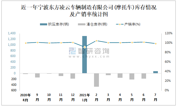 近一年寧波東方凌云車輛制造有限公司庫存情況及產(chǎn)銷率統(tǒng)計圖
