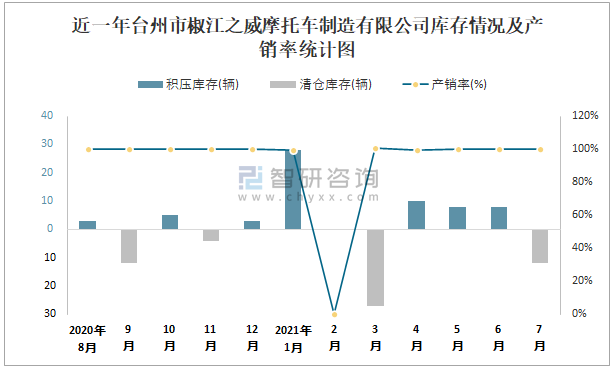 根據中國汽車工業(摩托車)產銷快訊數據統計可知:近一年臺州市椒江之威摩托車制造有限公司(摩托車)共積壓庫存10輛,其產銷率存在一定幅度波動,3月產銷率最高(100.68%),清倉庫存27輛,1月產銷率偏低(99.46%),積壓庫存28輛;近一年臺州市椒江之威摩托車制造有限公司(摩托車)暫未出口,全部依靠內銷。