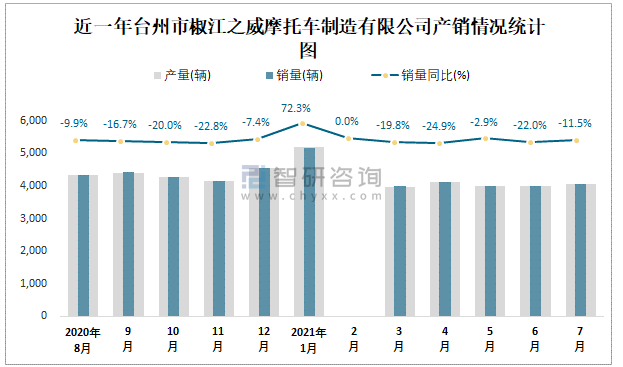 近一年臺州市椒江之威摩托車制造有限公司產銷情況統計圖