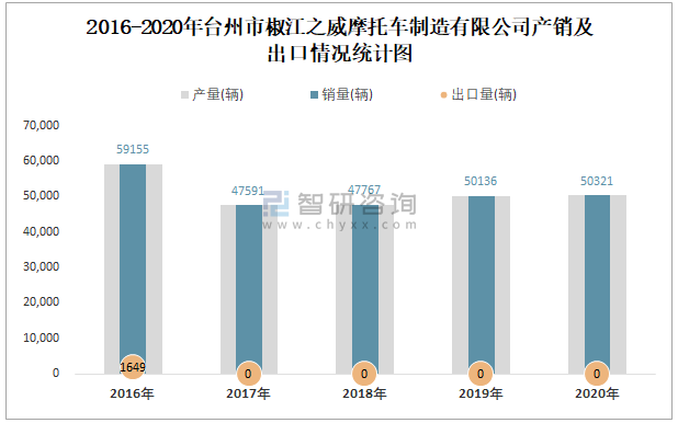 2016-2020年臺州市椒江之威摩托車制造有限公司產銷及出口情況統計圖