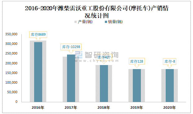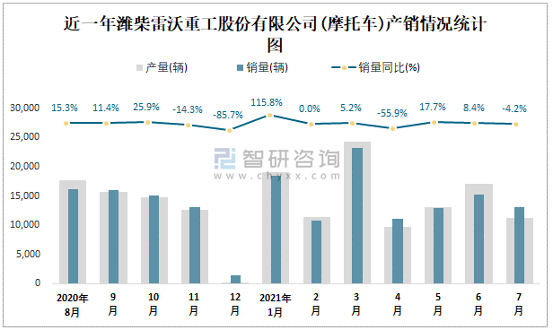 根據(jù)中國汽車工業(yè)(摩托車)產(chǎn)銷快訊數(shù)據(jù)顯示:2021年7月濰柴雷沃重工股份有限公司(摩托車)產(chǎn)量為11313輛,同比下降17.1%,銷量為13053輛,同比下降4.18%;2021年1-7月濰柴雷沃重工股份有限公司(摩托車)累計產(chǎn)量為105870輛,同比下降3.15%,累計銷量為104738輛,同比下降3.44%;2016-2020年濰柴雷沃重工股份有限公司(摩托車)產(chǎn)銷量逐年遞減,且近5年總銷量大于總產(chǎn)量,清倉庫存1062輛,暫未出口,全部依靠內(nèi)銷。
