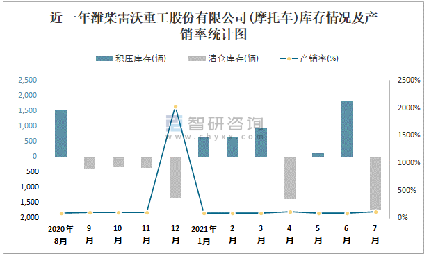 根據(jù)中國汽車工業(yè)(摩托車)產(chǎn)銷快訊數(shù)據(jù)統(tǒng)計可知:近一年濰柴雷沃重工股份有限公司(摩托車)共積壓庫存285輛,其產(chǎn)銷率存在一定幅度波動,2020年12月產(chǎn)銷率最高(2040.58%),清倉庫存1339輛,6月產(chǎn)銷率偏低(89.14%),積壓庫存1849輛;近一年濰柴雷沃重工股份有限公司(摩托車)暫未出口,全部依靠內(nèi)銷。
