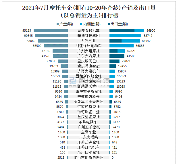 2021年7月摩托車企(擁有10-20年企齡)產(chǎn)銷及出口量(以總銷量為主)排行榜