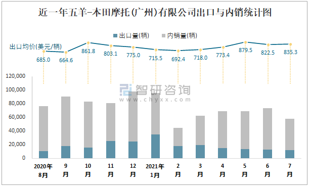 根據中國汽車工業(摩托車)產銷快訊數據統計可知:2021年7月中國摩托車產量總計為1721567輛,同比增長5.6%,銷量總計為1721887輛,同比增長4.26%,產銷率約為100.02%,清倉庫存-320輛,其中總計出口量為723084輛,內銷998803輛,出口均價約為633.62美元/輛。五羊-本田摩托(廣州)有限公司作為中外合資的摩托車企業之一,7月銷量相較于同類型車企,排名第1,且以內銷為主。
