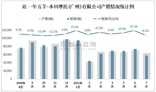 近一年五羊-本田摩托(廣州)有限公司產銷情況統計圖