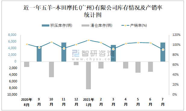 近一年五羊-本田摩托(廣州)有限公司庫存情況及產銷率統計圖