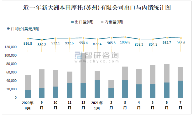 根據中國汽車工業(摩托車)產銷快訊數據統計可知:近一年新大洲本田摩托(蘇州)有限公司(摩托車)共積壓庫存42146輛,其產銷率存在一定幅度波動,2月產銷率最高(130.62%),清倉庫存10070輛,2020年9月產銷率偏低(75.8%),積壓庫存21454輛;近一年新大洲本田摩托(蘇州)有限公司(摩托車)出口量偏少,銷量以內銷為主,總出口量占比總銷量的46.6%,出口均價3月達到最高值,此后總體呈現下降趨勢,其中7月出口量為41032輛,出口均價約為953.56美元/輛;2021年1-7月新大洲本田摩托(蘇州)有限公司(摩托車)累計出口量為250710輛,同比增長73.11%,累計出口金額約為23346.2萬美元,同比增長95.85%。