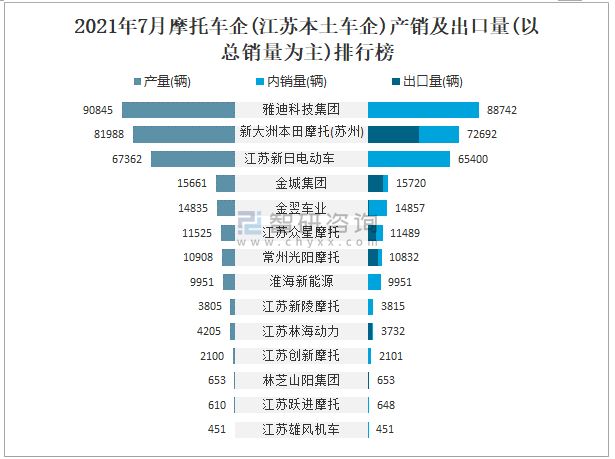 2021年7月摩托車企(江蘇本土車企)產銷及出口量(以總銷量為主)排行榜