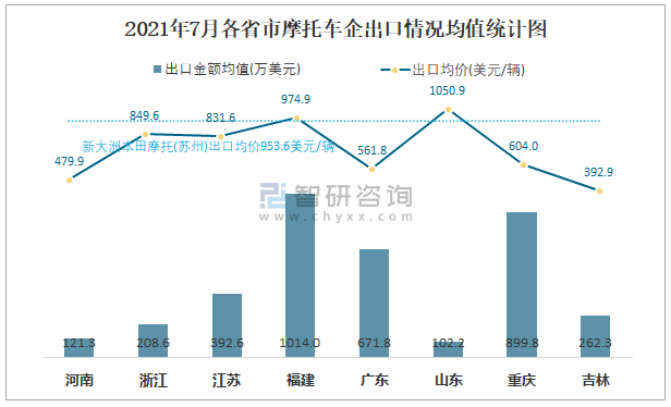 2021年7月各省市摩托車企出口情況均值統計圖