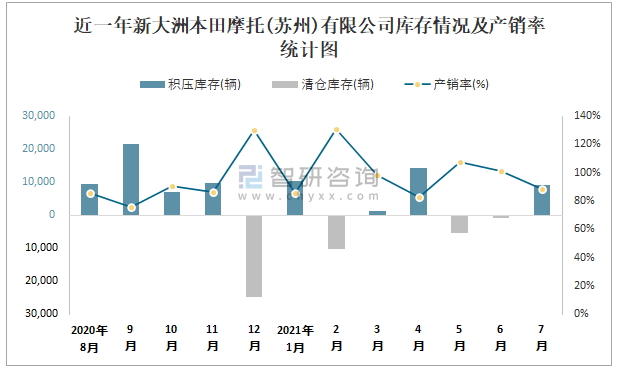 近一年新大洲本田摩托(蘇州)有限公司庫存情況及產銷率統計圖
