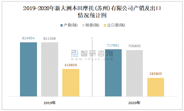 2019-2020年新大洲本田摩托(蘇州)有限公司產銷及出口情況統計圖