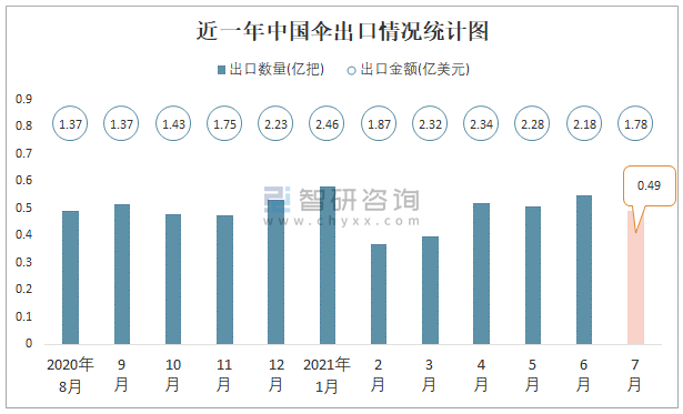 根據(jù)中國海關(guān)數(shù)據(jù)顯示:2021年7月中國傘出口數(shù)量為0.49億把,同比下降10.5%,出口金額為1.78億美元,同比增長(zhǎng)4.9%;2021年1-7月中國傘,出口數(shù)量為3.41億把,出口金額為15.19億美元。