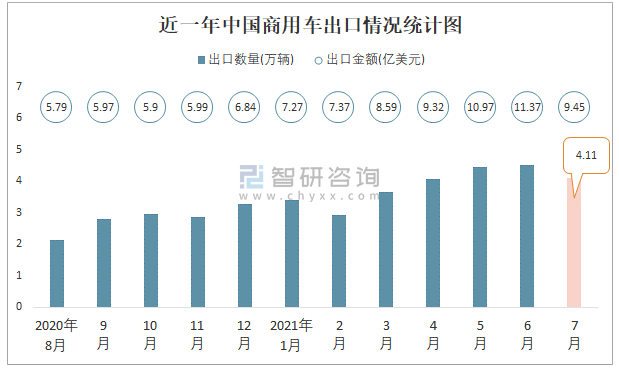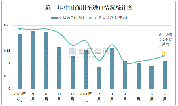 根據中國海關數據顯示:2021年7月中國商用車進口數量為0.11萬輛,同比下降40.9%,進口金額為1.04億美元,同比下降37.3%,2021年7月中國商用車出口數量為4.11萬輛,同比增長98.4%,出口金額為9.45億美元,同比增長57.9%;2021年1-7月中國商用車進口數量為0.81萬輛,進口金額為7.46億美元,出口數量為27.14萬輛,出口金額為64.37億美元。