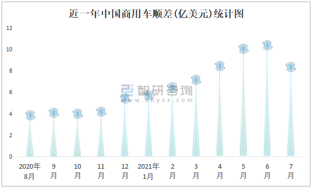根據中國海關數據顯示:近一年中國商用車進口金額總體小于出口金額,進出口貿易全部為順差,順差規模總體呈擴大趨勢,順差規模并在6月達到最大,7月有所縮減。
