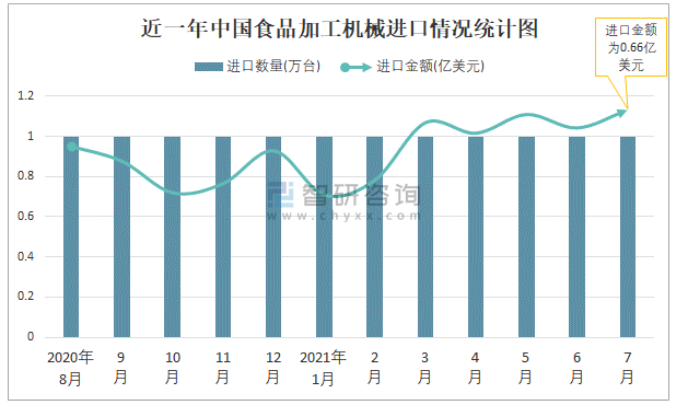 根據(jù)中國(guó)海關(guān)數(shù)據(jù)顯示:2021年7月中國(guó)食品加工機(jī)械進(jìn)口數(shù)量為1萬(wàn)臺(tái),同比增長(zhǎng)56.4%,進(jìn)口金額為0.66億美元,同比增長(zhǎng)17.3%,2021年7月中國(guó)食品加工機(jī)械出口數(shù)量為69萬(wàn)臺(tái),同比增長(zhǎng)24.1%,出口金額為1.58億美元,同比增長(zhǎng)41.1%;2021年1-7月中國(guó)食品加工機(jī)械進(jìn)口數(shù)量為8萬(wàn)臺(tái),進(jìn)口金額為4.03億美元,出口數(shù)量為491萬(wàn)臺(tái),出口金額為9.45億美元。